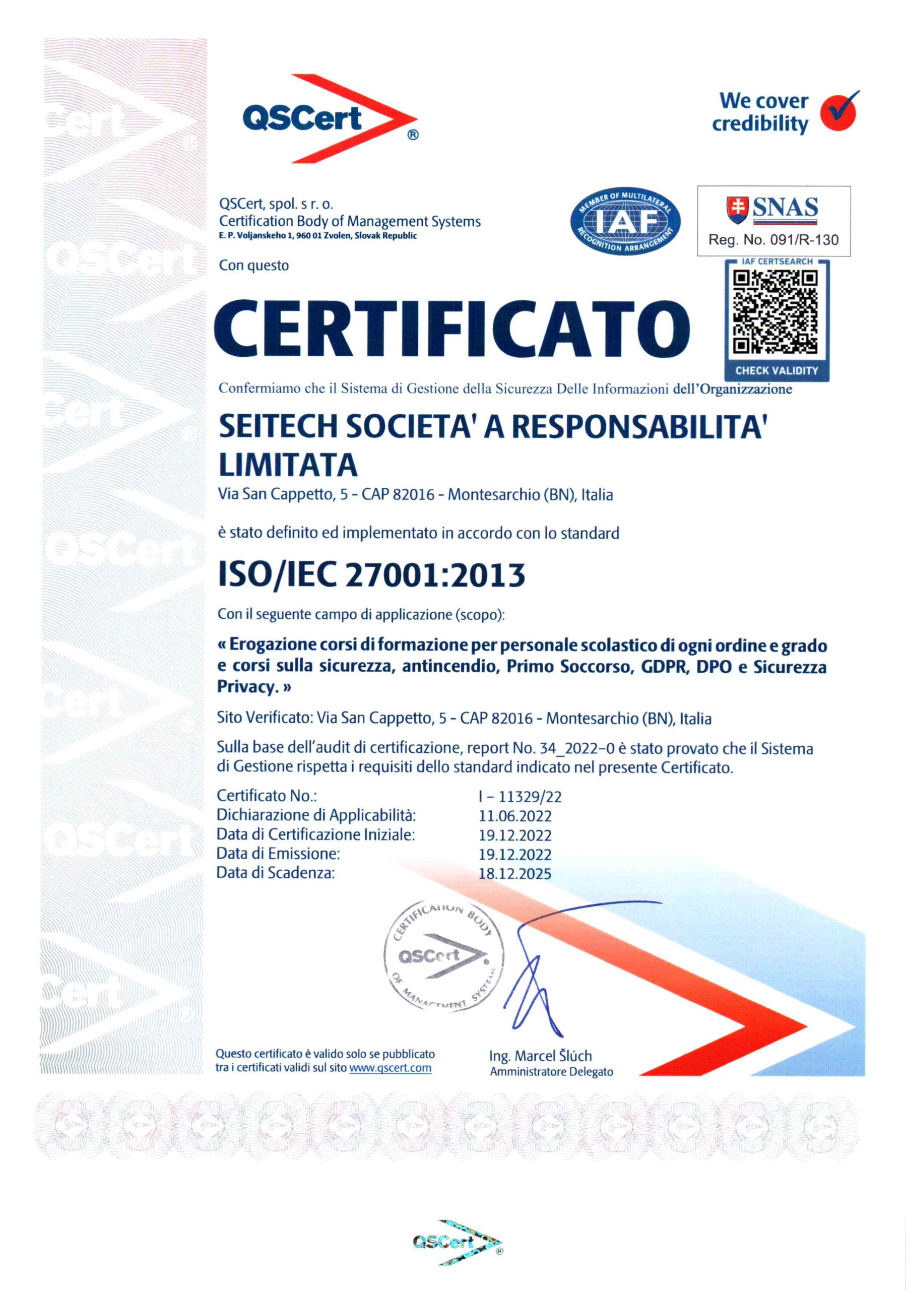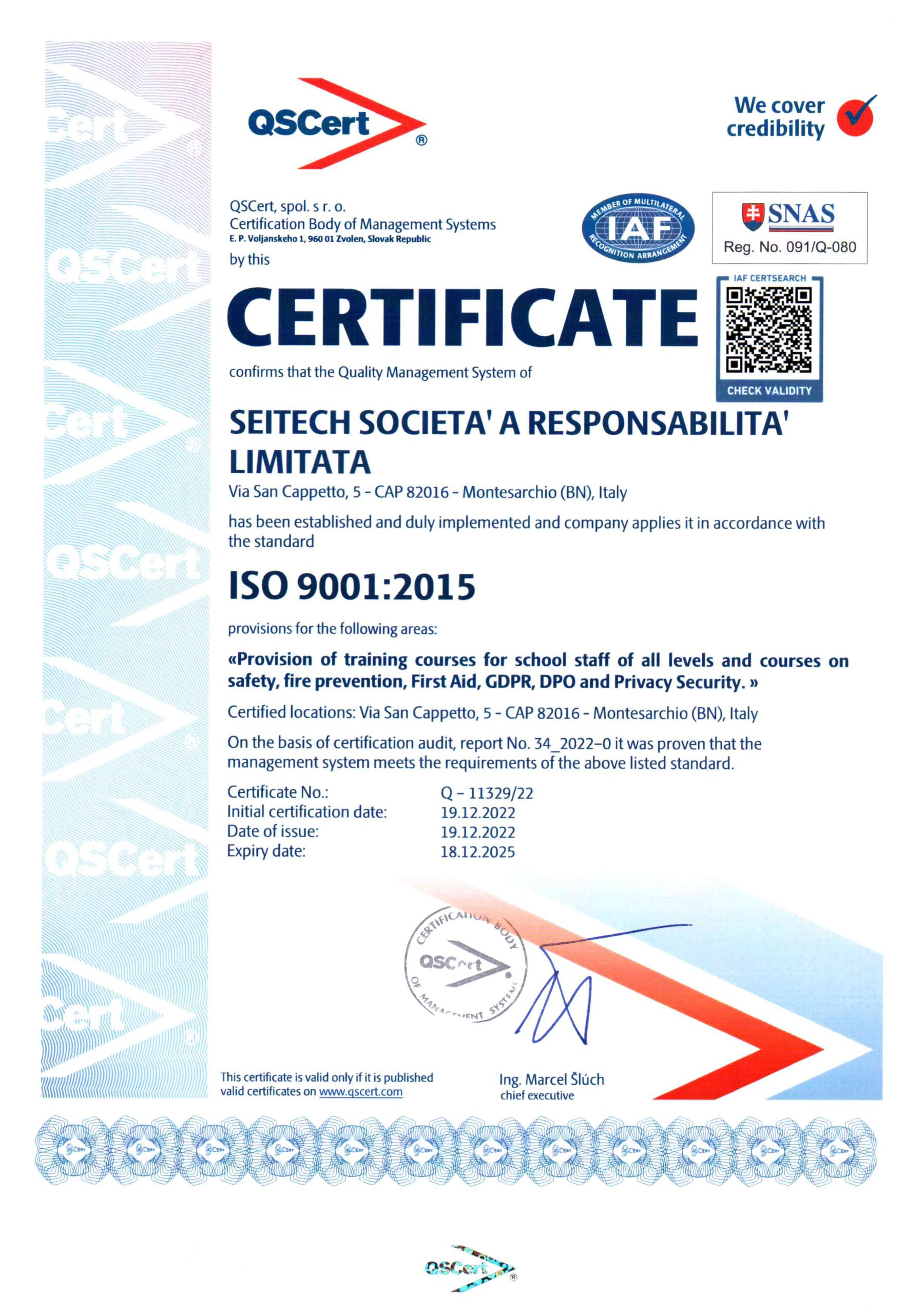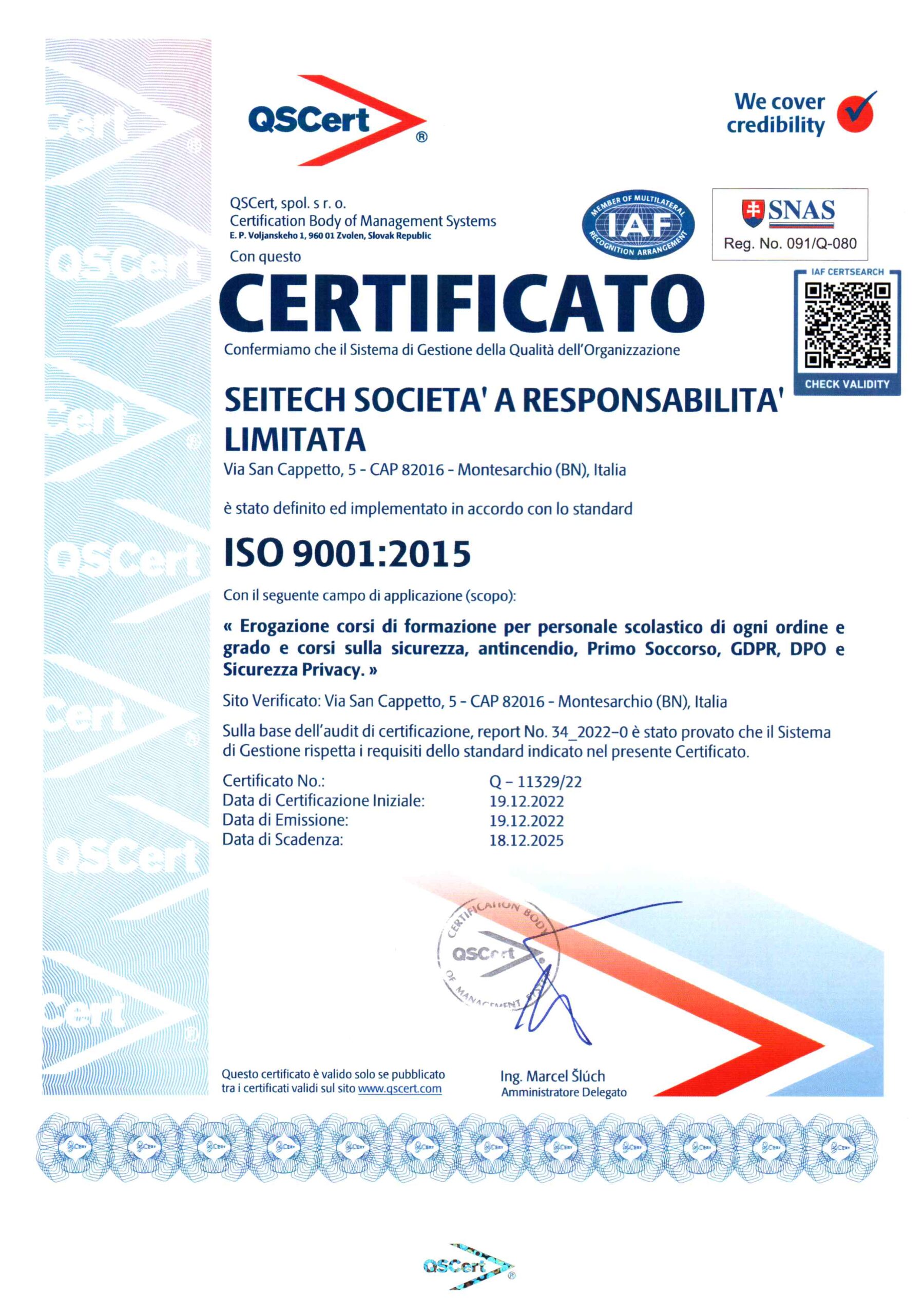 Seitech ha conseguito il CERTIFICATO Internazionale ISO/IEC 9001:2015 che definisce e certifica che l’azienda utilizza standard verificati sulla sicurezza delle informazioni. Questa certificazione stabilisce i criteri per un sistema di gestione della qualità (SGQ) ed è utilizzata da organizzazioni di ogni dimensione e settore per assicurare che i propri prodotti e servizi soddisfino costantemente i requisiti dei clienti e che la qualità sia continuamente migliorata.